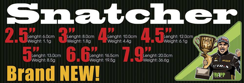 На выбор семь размеров: 2.5”, 3”, 4”, 4.5”, 5”, 6.6” и 7.9”. Масса наиболее деликатного Snatcher 2.5” — 1.1 г. Самая крупная модель длиной 7.9” (20 см) имеет массу 36.6 г.
