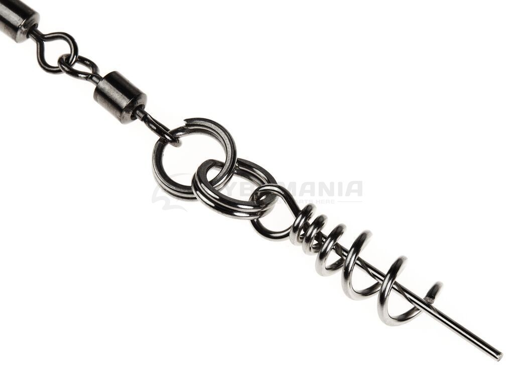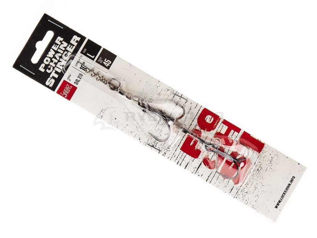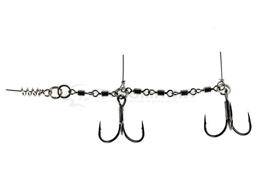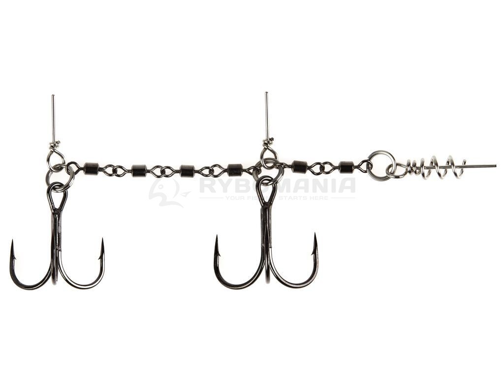 Stinger Power Chain - готовая оснастка для быстрого оснащения крупных силиконовых приманок. Состоит из качественной вертлюжков, которые предотвращают перекручивание оснастки и кованых колец и шипов stinger, а также 2 качественных тройников. Оснастки такого типа, со спиралью и шипами, позволяют дольше сохранять силиконовые приманки от щучьих зубов, а так же не нарушают игру.