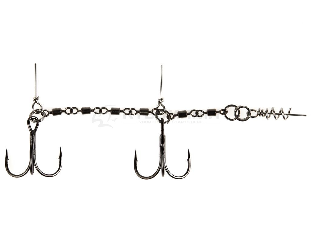 Stinger Power Chain - готовая оснастка для быстрого оснащения крупных силиконовых приманок. Состоит из качественной вертлюжков, которые предотвращают перекручивание оснастки и кованых колец и шипов stinger, а также 2 качественных тройников. Оснастки такого типа, со спиралью и шипами, позволяют дольше сохранять силиконовые приманки от щучьих зубов, а так же не нарушают игру.