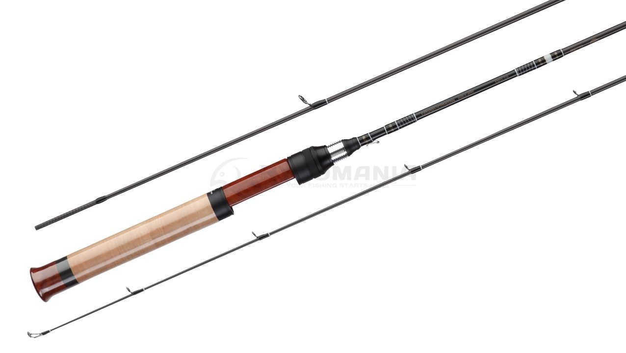Катушкодержатель с передней гайкой обеспечивает легкую и маневренную работу удилищем. Двойная гайка, фиксирующая катушку, дает надежную защиту от раскручивания. Вставка изготовлена из редкой и ценной древесины, которая отличается твердостью и долговечностью. Прямая форма удобно ложится в руку и позволяет использовать различные техники хвата, а ее тонкий диаметр позволяет легко расслабить хват и облегчает тонкие манипуляции с удилищем. Задняя часть рукояти выполнена из качественной пробки, а на конце рукояти красуется навершие из той же редкой ценной породы дерева — палисандра, что и катушкодержатель, с металлической пластиной с изображением хищной птицы, вызывающей в памяти образ охотника.
